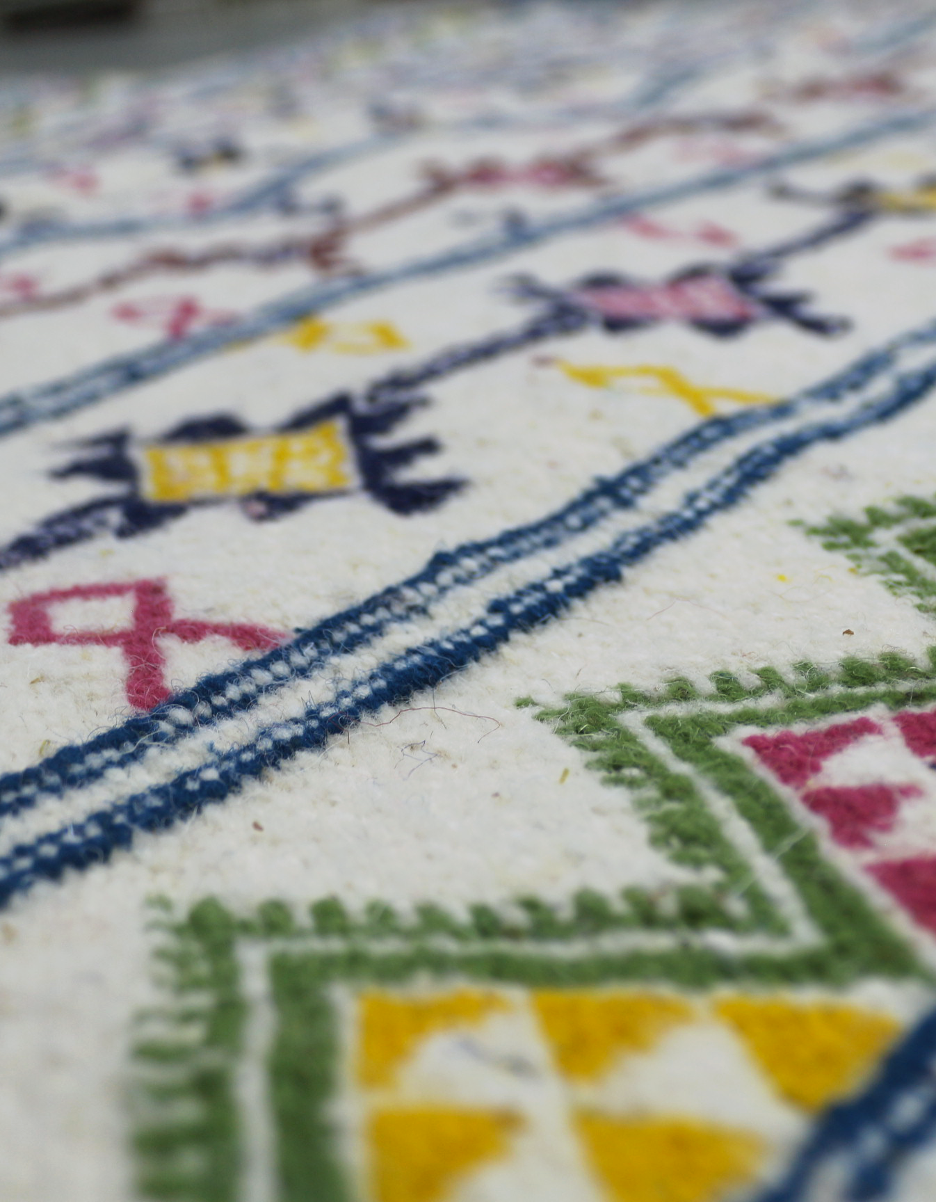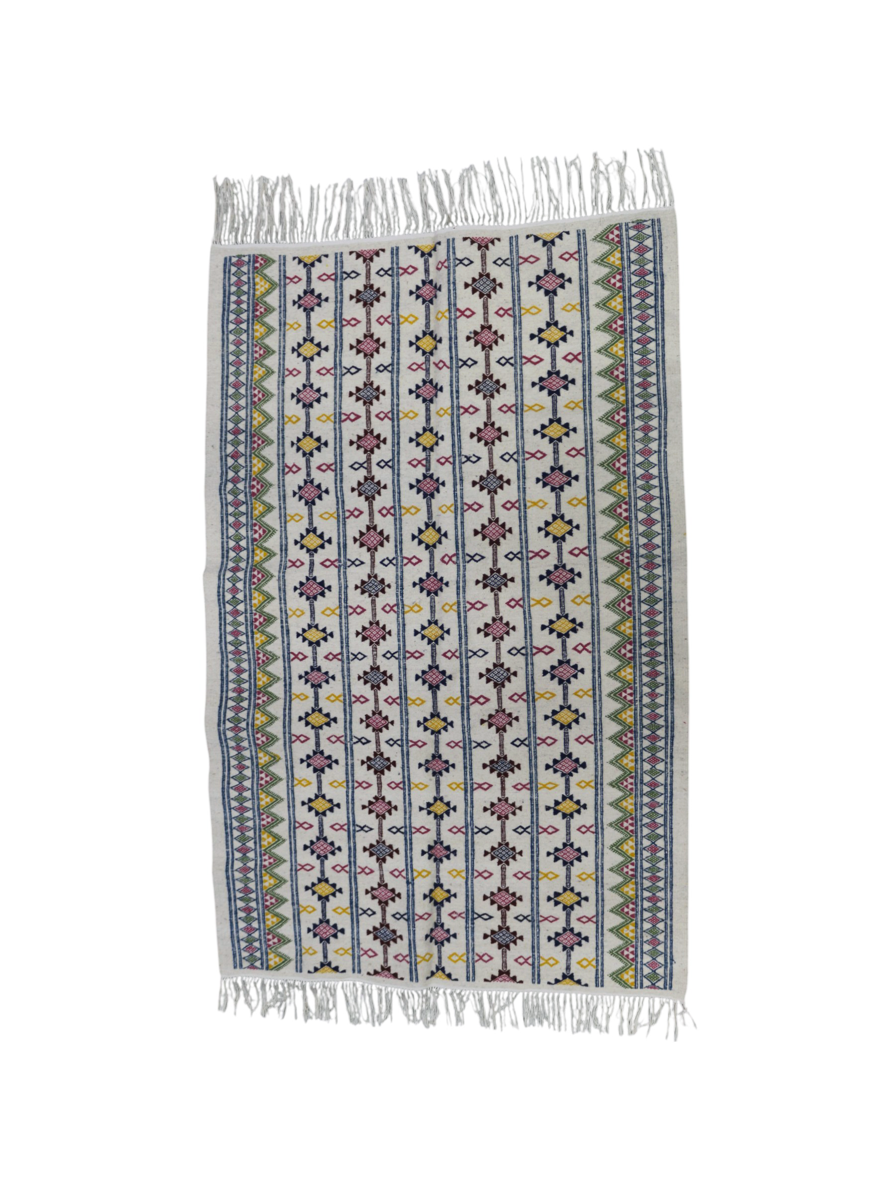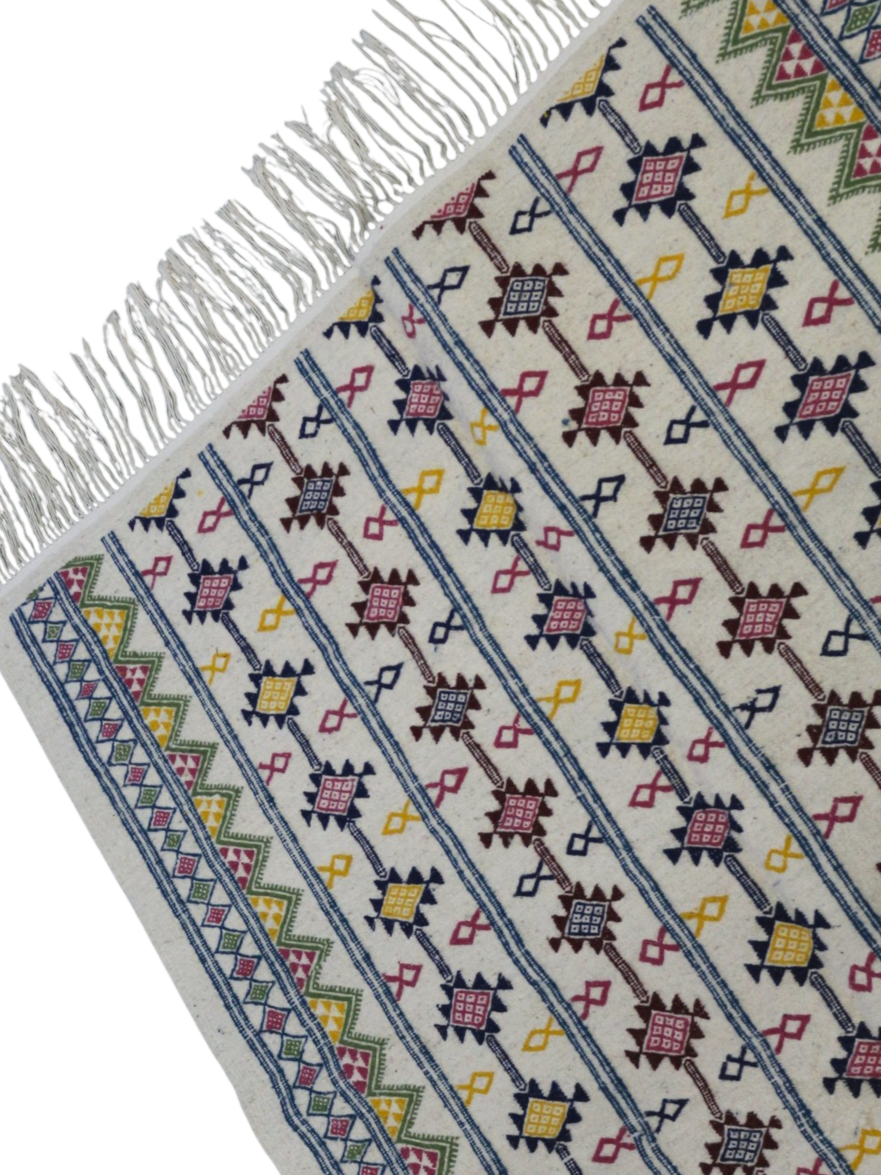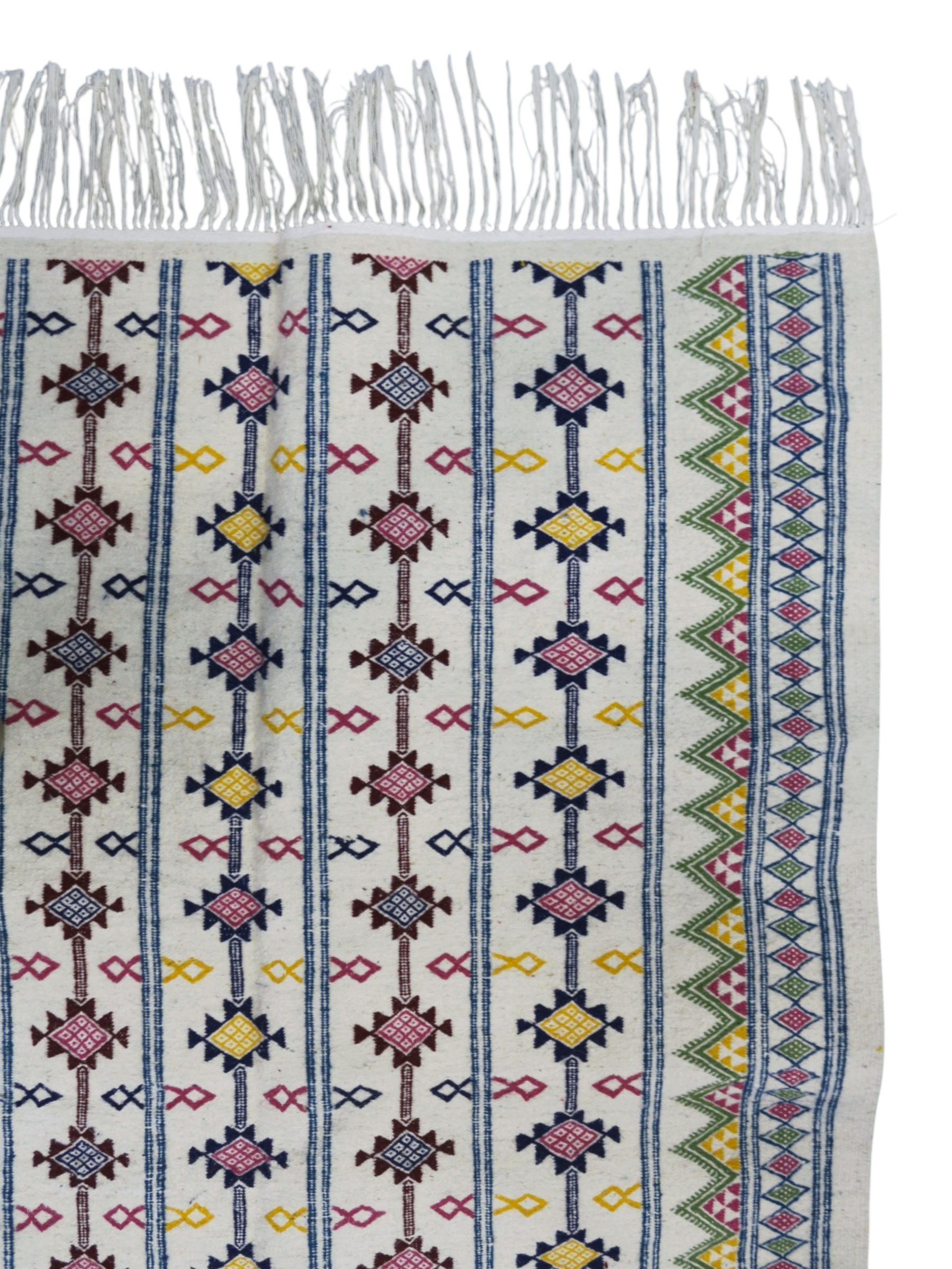 Fleur de Médina is a radiant Margoum rug inspired by the delicate beauty of blooming gardens. Handwoven with precision, its vibrant rows of geometric florals are framed by lively borders in green and fuchsia, adding a touch of joy and refinement. Light, elegant, and full of personality, it brightens any interior with the timeless soul of Tunisian craftsmanship.