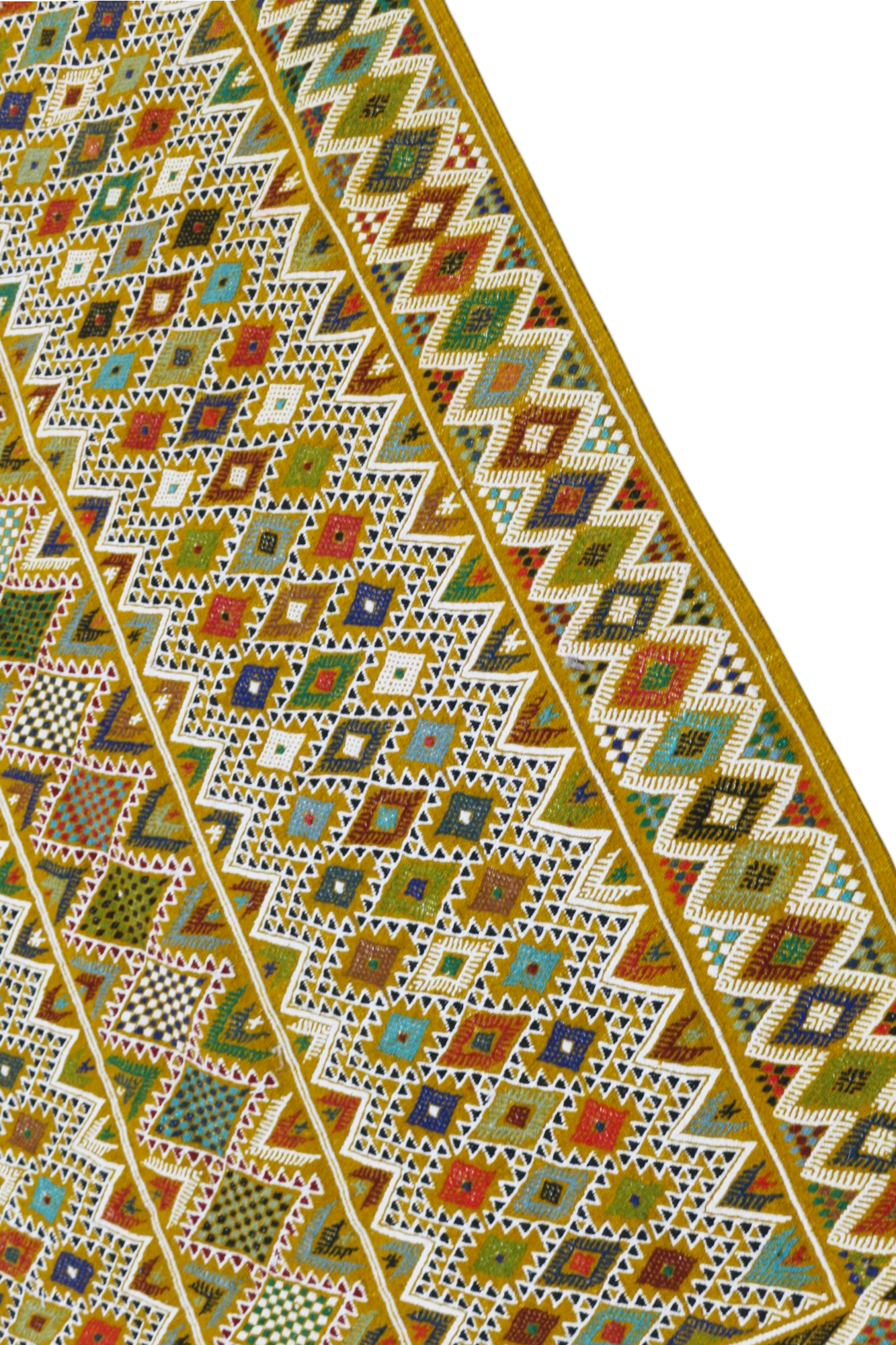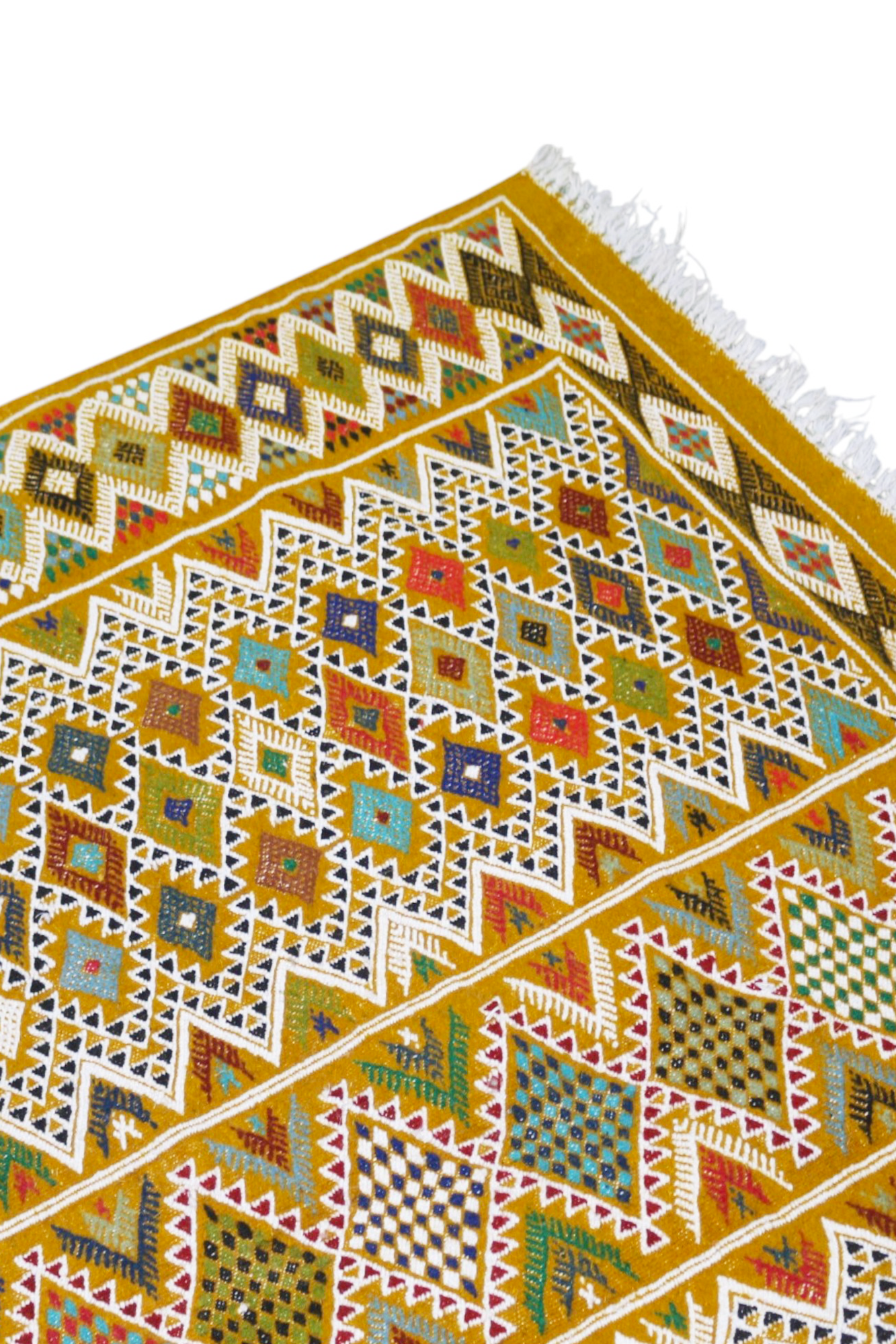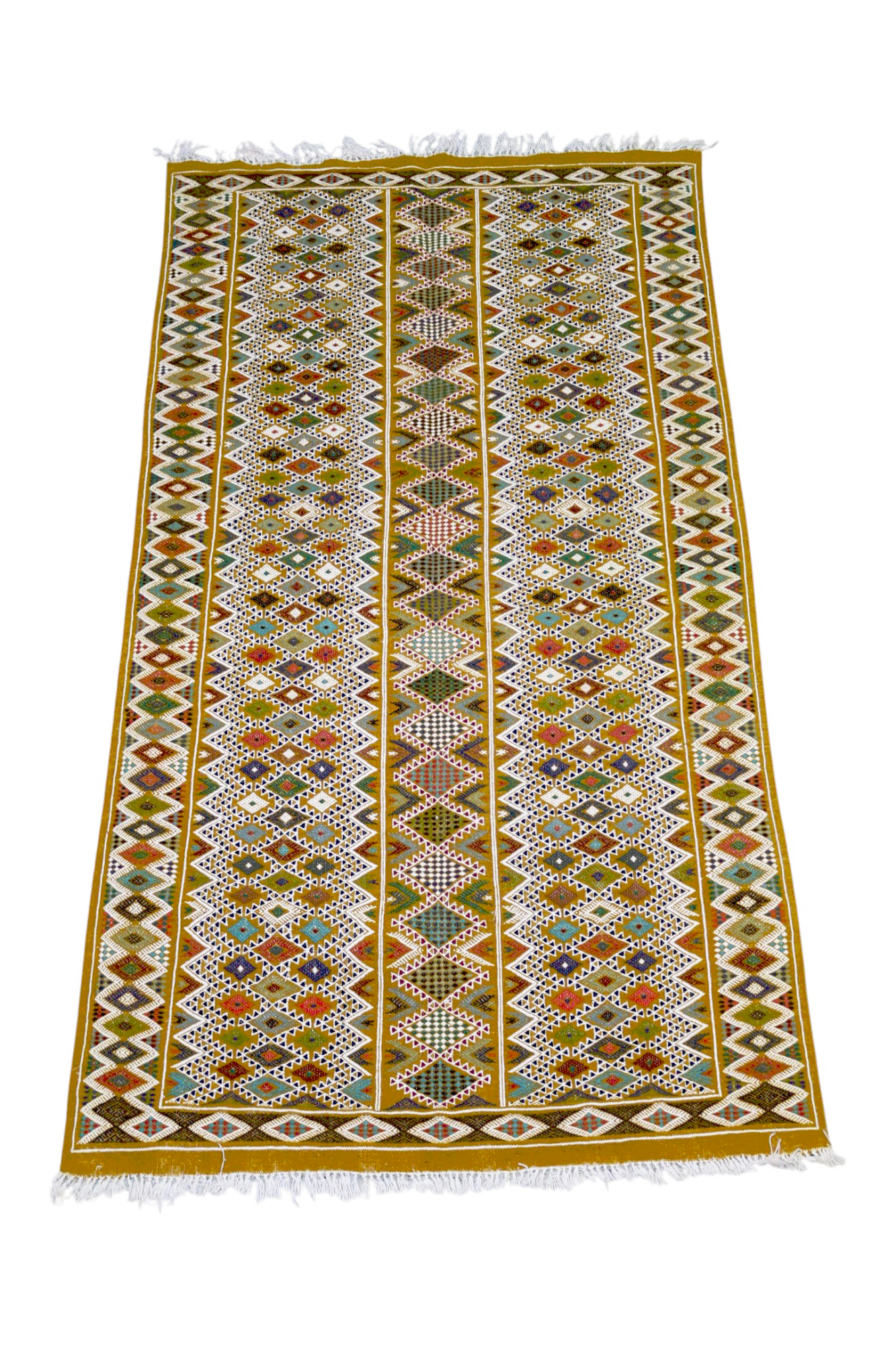 Inspired by the colors of Tunisian landscapes, Sable d’Atlas is a handwoven Margoum rug that blends earthy tones with intricate Berber patterns. The repeating diamond motifs symbolize protection and harmony, while the warm hues of mustard, clay, and olive evoke the spirit of desert craftsmanship. A bold, timeless piece that brings character and cultural depth to any room.